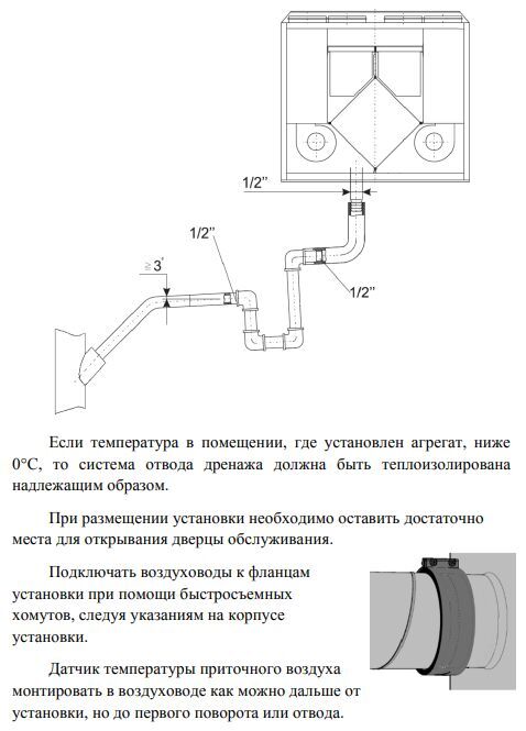 Для отвода конденсата из установки необходимо предусмотреть дренажную трассу с сифоном. Уклон труб должен быть не менее 3° (1 м трубы должен быть наклонен вниз на 55 мм). Перед запуском установки дренажная трасса должна быть испытана, а сифон - заполнен водой.