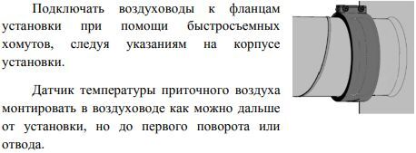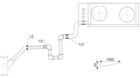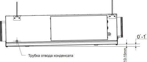 Монтаж и подключение выполняется компетентным персоналом. Установки крепятся к потолку при помощи шпилек. При размещении установки необходимо оставить достаточно места для открывания дверей обслуживания. Для отвода конденсата из установки необходимо предусмотреть дренажную трассу с сифоном Уклон труб должен быть не менее 3° (1 м трубы должен быть наклонен вниз на 55 мм). Перед запуском установки дренажная трасса должна быть испытана, а сифон - заполнен водой. Если температура в помещении, где установлен агрегат, ниже 0°С, то система отвода дренажа должна быть теплоизолирована надлежащим образом.