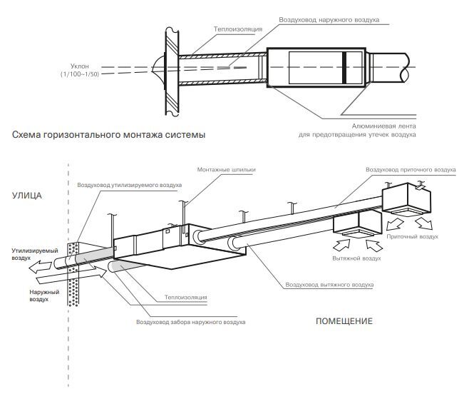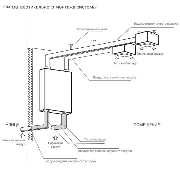 Требования по монтажу: 1. Установки монтируются как горизонтально (в стандартном либо перевернутом положении), так и вертикально, в соответствии с направлением потока воздуха. 2. Обратите внимание на высоту свободного пространства под подвесным потолком. Оно не должно быть меньше указанного. 3. Необходимо предусматривать доступ для обслуживания установок. 4. При монтаже воздуховодов избегайте большого числа поворотов трассы и уменьшения сечения ниже диаметра патрубков установки. 5. Длина воздуховодов должна быть как можно меньше. 6. Во избежание образования конденсата, воздуховоды наружного и выбрасываемого воздуха должны быть теплоизолированы. 7. Для предотвращения попадания вытяжного воздуха в приточный канал, снаружи, необходимо размещать вентиляционные отверстия забора и выброса воздуха на расстоянии не менее 1000 мм друг от друга. 8. Наружные отверстия воздуховодов должны быть защищены от проникновения осадков и птиц, например, защитной решеткой. 9. Места прохода воздуховодов через стены должны быть звуко-, тепло- и влагоизолированы. 10. Подключать воздуховоды следует в соответствии со схемой подключения. 11. Вспомогательный нагреватель необходимо монтировать с отрезками воздуховода не менее 500 мм на входе и выходе нагревателя.